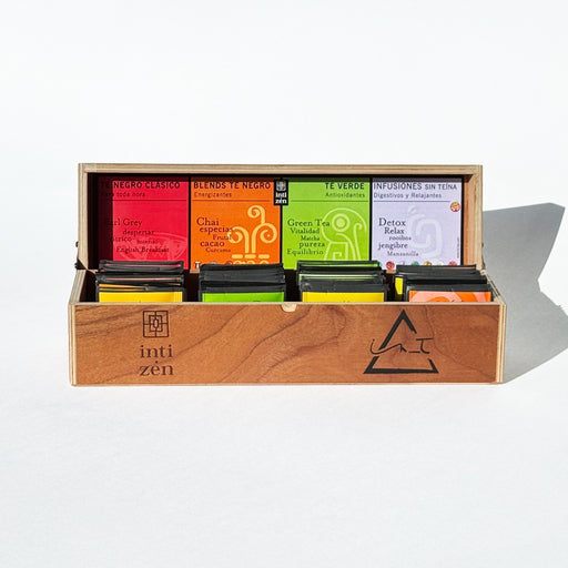 Incluye 18 saquitos de Inti Zen: 3 Vanilla Zen + 3 Patagonia Rooibos + 3 Tres Mentas + 3 Dulce Manzanilla + 3 Inti Yoga + 3 Calma Andina.
